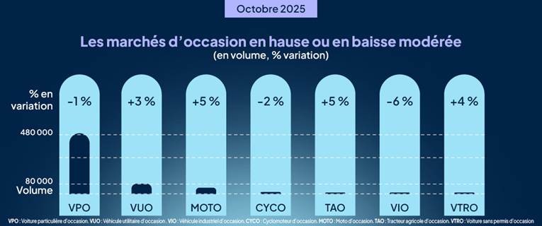Le marché du VO recule légèrement en octobre (-1% pour 483 743 transactions), toujours freiné par la rareté des modèles récents. Les voitures de plus de 10 ans et les motorisations électrifiées tirent leur épingle du jeu : +34% pour les électriques, +23% pour les full hybrides (HEV).